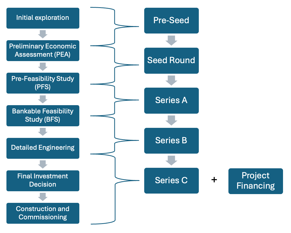 If you read my “How to build a mine” posts (or at least Part 2), then you might recall a schematic I shared comparing mine development to venture investing stages. If not, here it is again:
