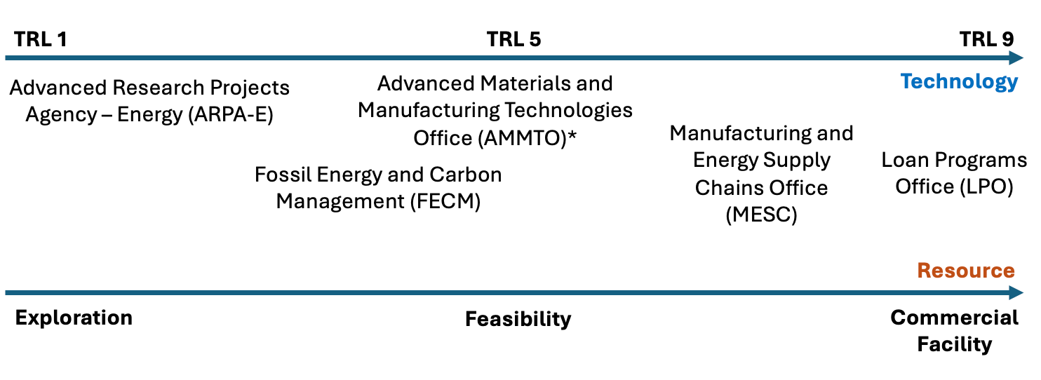 EERE included many sub-offices dedicated to different energy technologies. The Advanced Materials and Manufacturing Technologies Office (AMMTO) had primary responsibility within EERE for mining and minerals processing technologies, but others including the Geothermal Technologies Office (GTO) and Vehicle Technologies Office (VTO) had some programming supporting critical minerals as well.